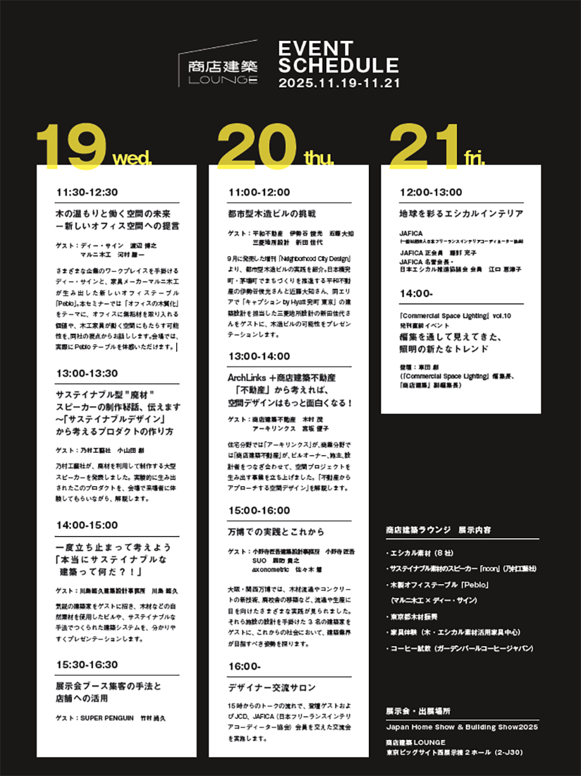 2025年11月19日(水)~21日(金)に開催される「ジャパンホームショー&ビルディングショー2025」内の「商店建築ラウンジ」にて、