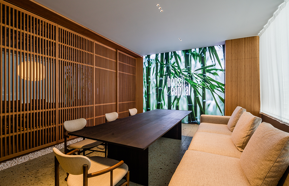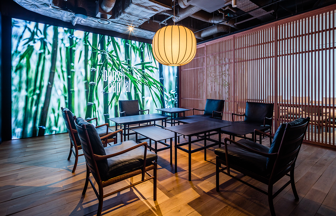 創業間もないブーストキャピタルにとって、オフィスは単なる執務の場ではなく「資本の美学」を可視化する装置であると考えました。麻布台ヒルズというベンチャーキャピタルの拠点が集まる地において、日本的な静謐と洗練を体現することが求められました。海外投資家に伝わる日本らしさを核としつつも、単なる伝統の模倣ではなく、現代的機能と組み合わせて更新しています。木格子や竹の映像は、凛とした空気をつくりながら、来訪者に次のステージを感じさせる装置として作用します。創業期特有の不安定さを補い、投資先や投資家に「継続と覚悟を建築として表明すること」。それは同時に、スタートアップという生成の場を包み込み、資本と美学が交差する新しい風景を描く試みでもあります。