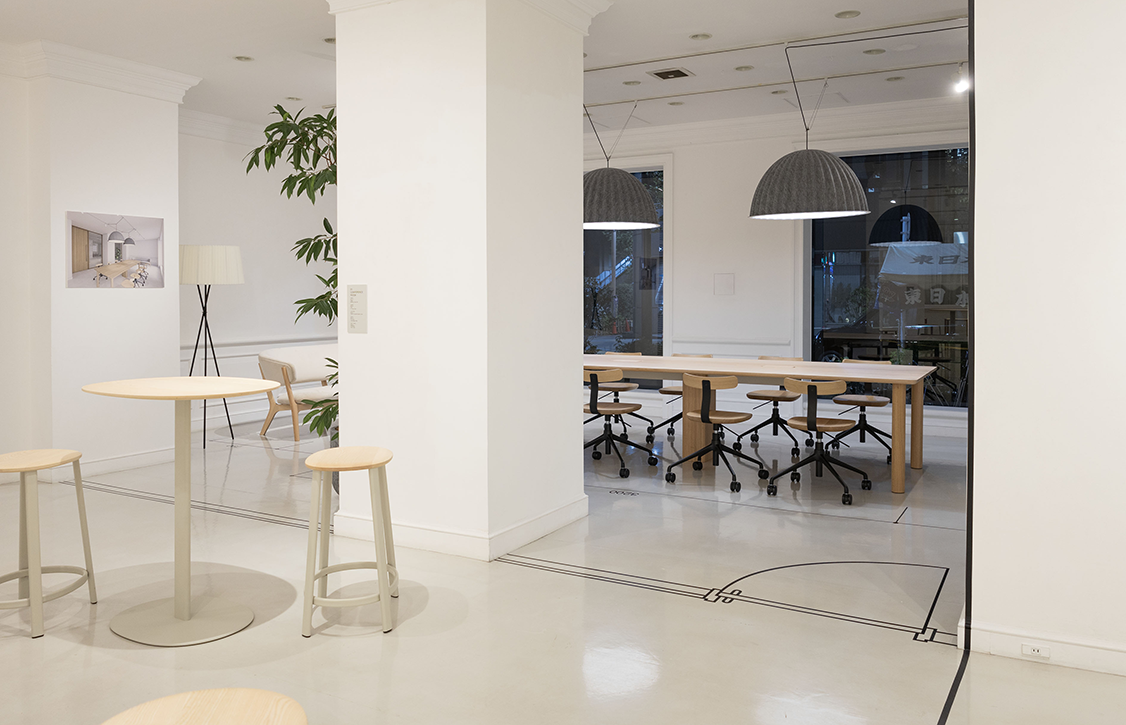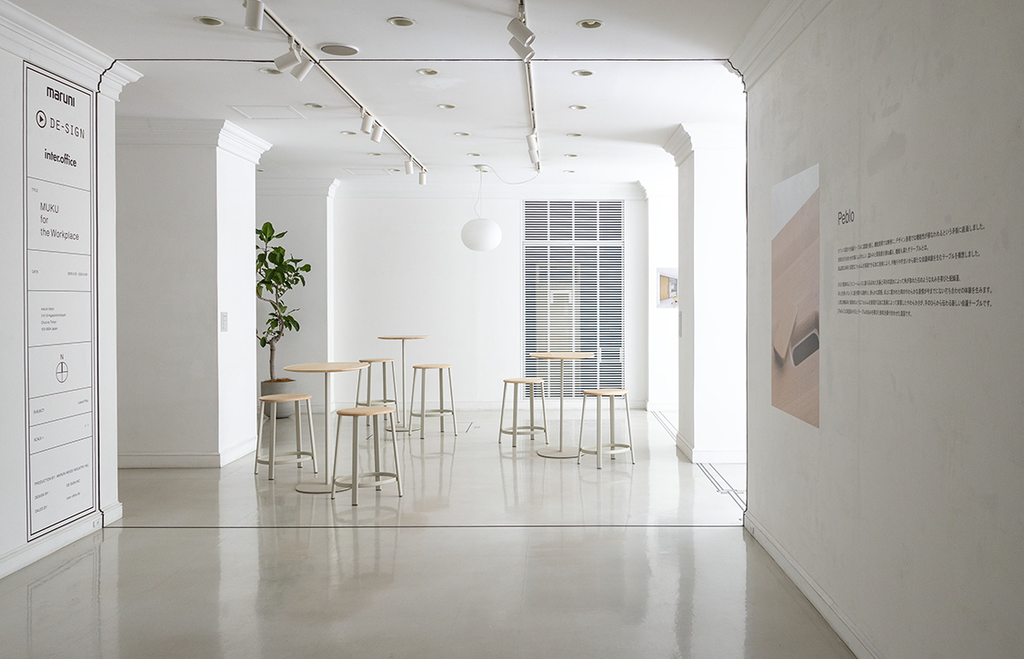 会場スペースでは「MUKU for the Workplace」と題し、マルニ木工、インターオフィス、ディー・サインの3社によるオフィスイメージを提案。来場者の多くが、主にオフィスデザインを行う設計事務所や不動産、家具メーカーのデザイナーであることも踏まえ、プロダクトアウトではない空間を心がけました。白い空間のなかに設計図をモチーフにした図面枠や寸法線を配置し、機能的なタスクチェアと組み合わせた展示により、“Peblo”を実際のオフィスプロジェクトに落とし込むイメージを視覚化しています。また、無垢材との相性を考えて敢えてカジュアルな照明と組み合わせ、オフィスデザインでも定番となった植栽をより多く配置するなど、細部にまでこだわって設計。無垢材をオフィスに取り入れる価値をより感じられるように、会場スペース全体をデザインしました。