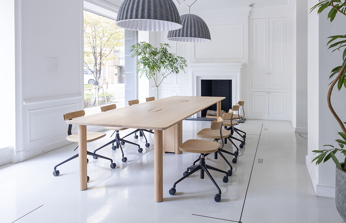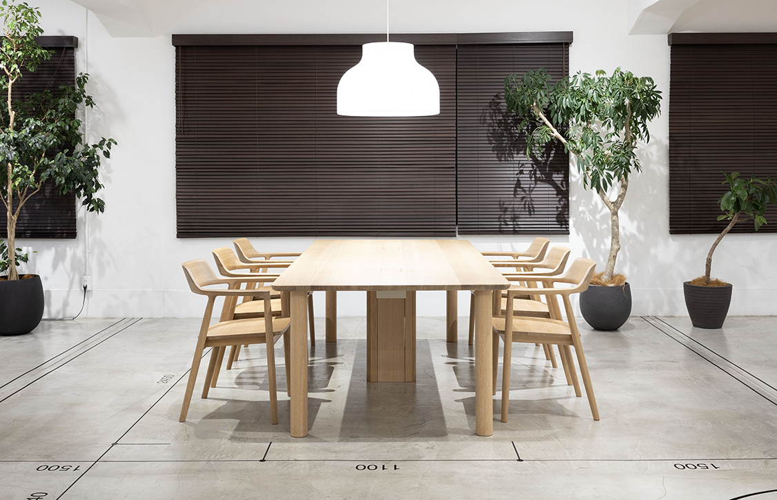 マルニ木工が大切にしているヒューマンタッチの考え方。そこに、私たちがオフィス設計を通じて培ってきた知見が掛け合わさってできたのが、会議テーブル“Peblo”。意匠性と機能性を両立しながら、マルニ木工らしい無垢の温もりを感じられる設計に仕上げています。