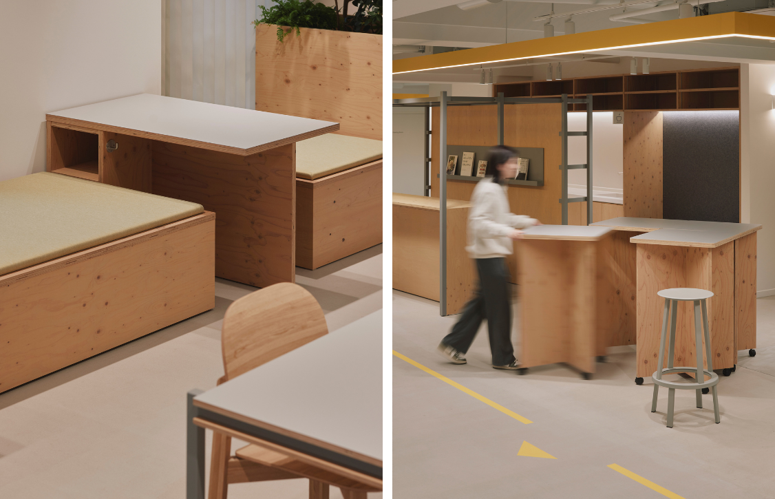 (左)構造的なデッドスペースにベンチやカウンターなどの造作家具を配すことで有効活用している。(右)可動式ハイテーブルは、イベント時などに他のカウンター家具と組み合わせて利用が可能。