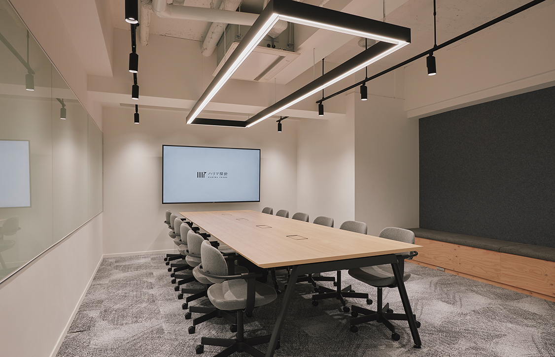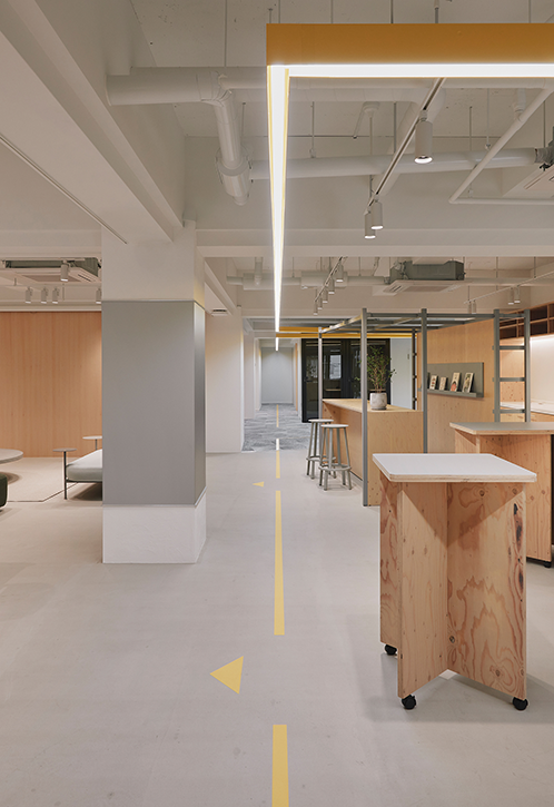 デザインコンセプトを“AGITO(アジト)”としながらも、閉鎖的な隠れ家のイメージではなく、 誰もが受け入れられる「柔らかさ」と「安心感」を重視しました。白と木目を基調とした温かみのあるデザインを採用しています。空間構成の鍵となるのは、エントランスから奥へと人々を誘うダイナミックな天井照明と床のサイン。これらが導線となり、エントランスからイベントも開催できる開放的な交流スペースが広がり、奥へと進むにつれて没入感のある集中エリアへと変化する「空間のグラデーション」を創出しています。築年数を経たビル特有の太い柱や窓際のデッドスペースを、あえて「居場所」に転換するなど、建物の制約を逆手にとった設計もポイントです。