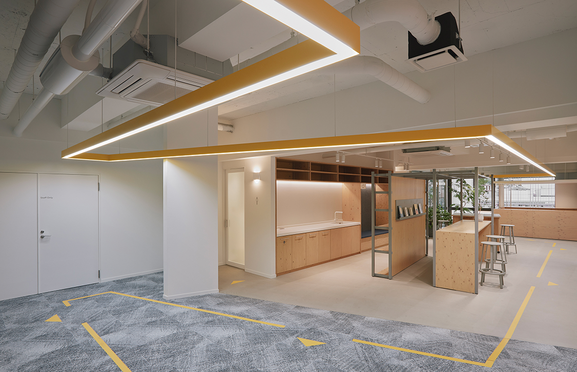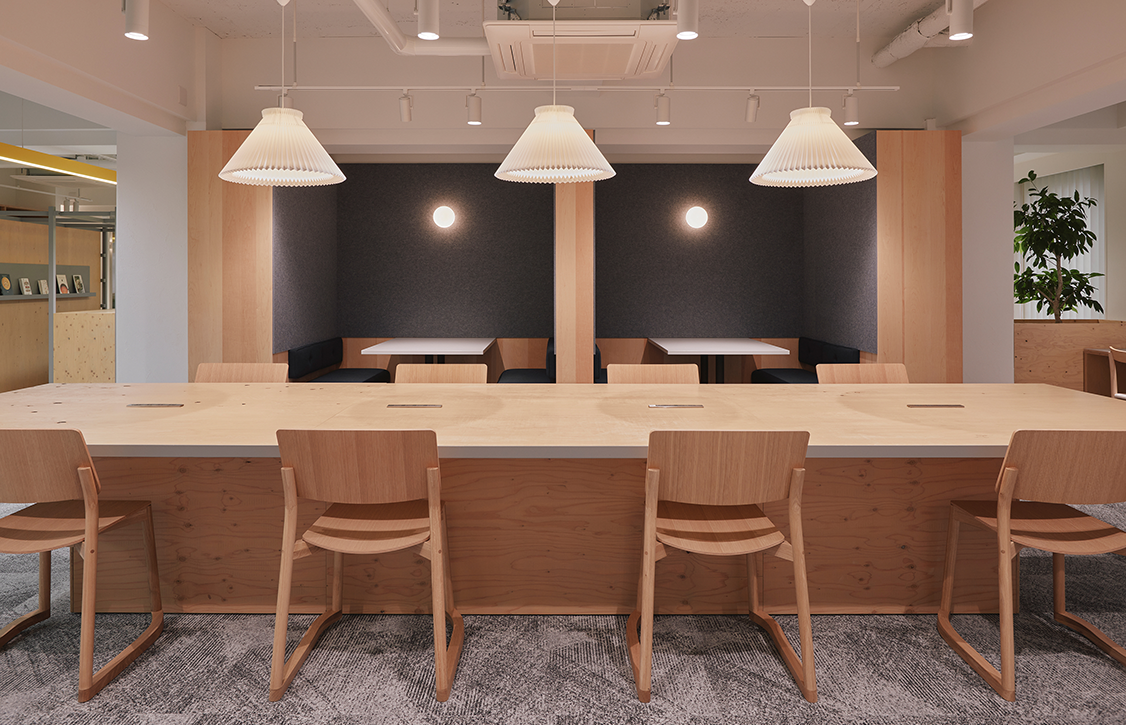 ワークスペース。各スペースの機能を照明で表現し、木の質感を大きく取り入れることで空間に安心感を与えている。