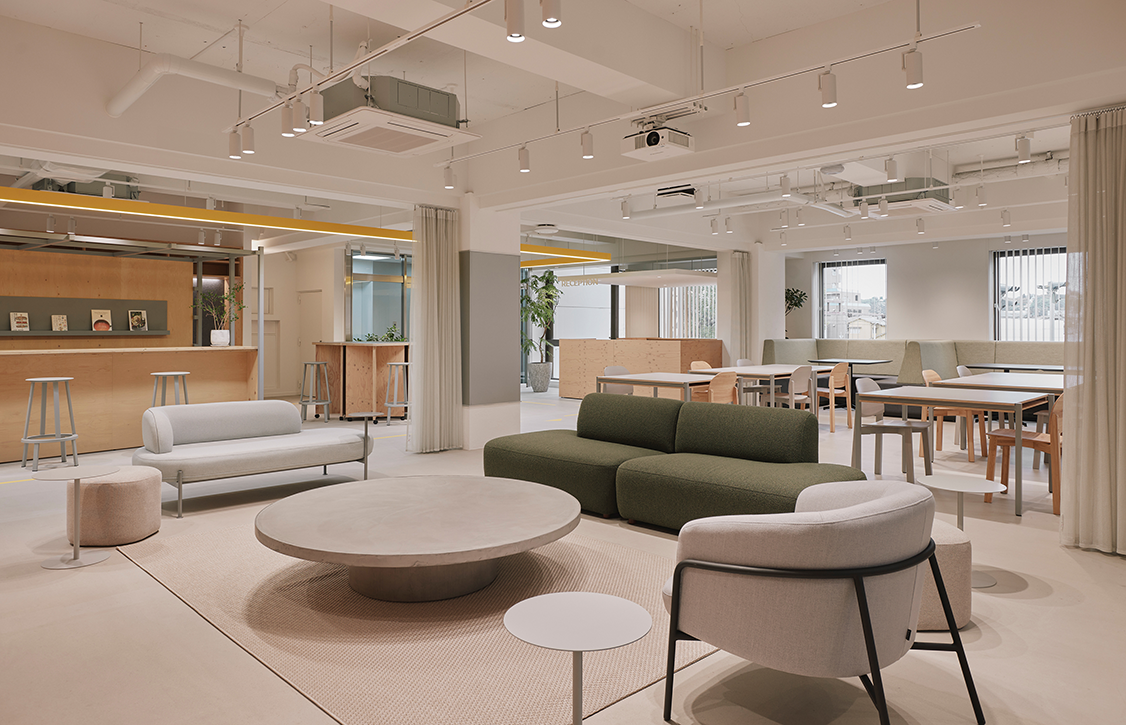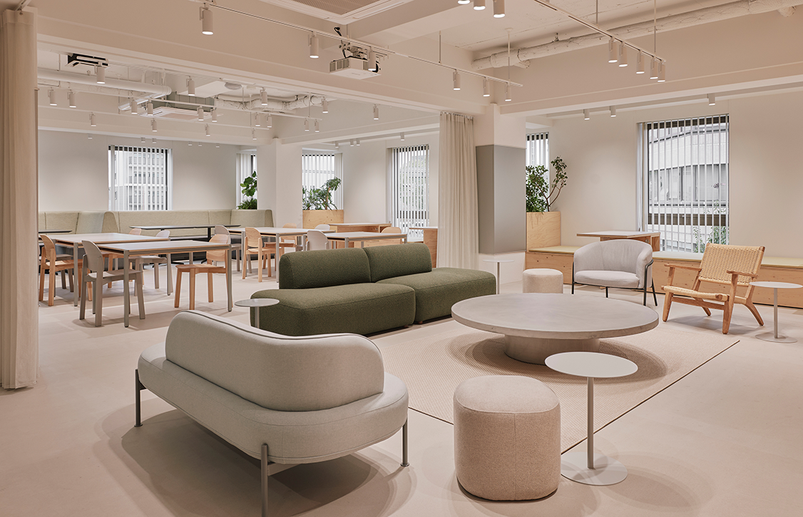 カフェスペースからイベントスペース。柔らかいトーンのファブリックと木質、触り心地の良い素材を中心に、空間の温度感を構築。