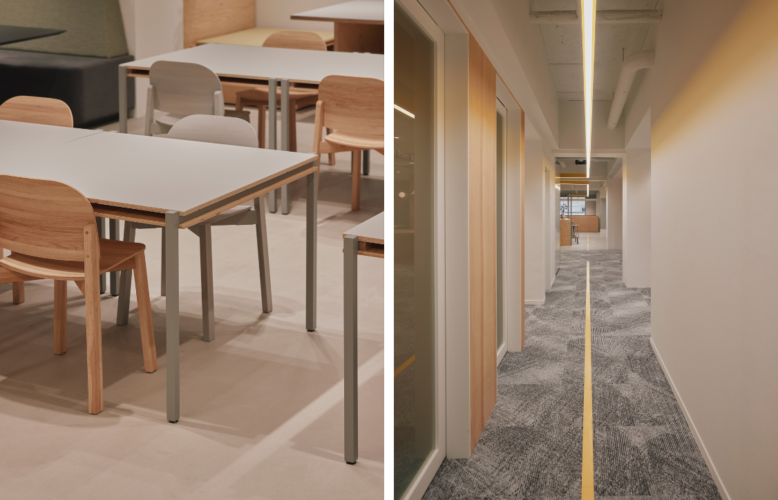(左)ワークにもコラボにも対応する、スタッキングテーブル。(右)照明のラインが美しく際立ち、空間全体をつなげる。