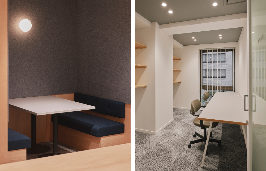 (左)半個室スペース。周りを気にせずにコミュニケーションを取りやすい暗めのトーンに設計。(右)シェアオフィススペースは、シンプルながら棚や電源など機能性も重視。